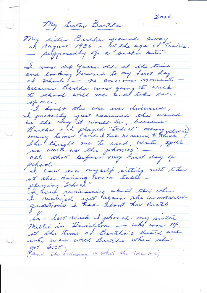 So, last week I phoned my sister Millie in Hamilton - who was 14 at the time of Bertha's death and who was with Bertha when she got sick. (and the following is what she told me).