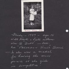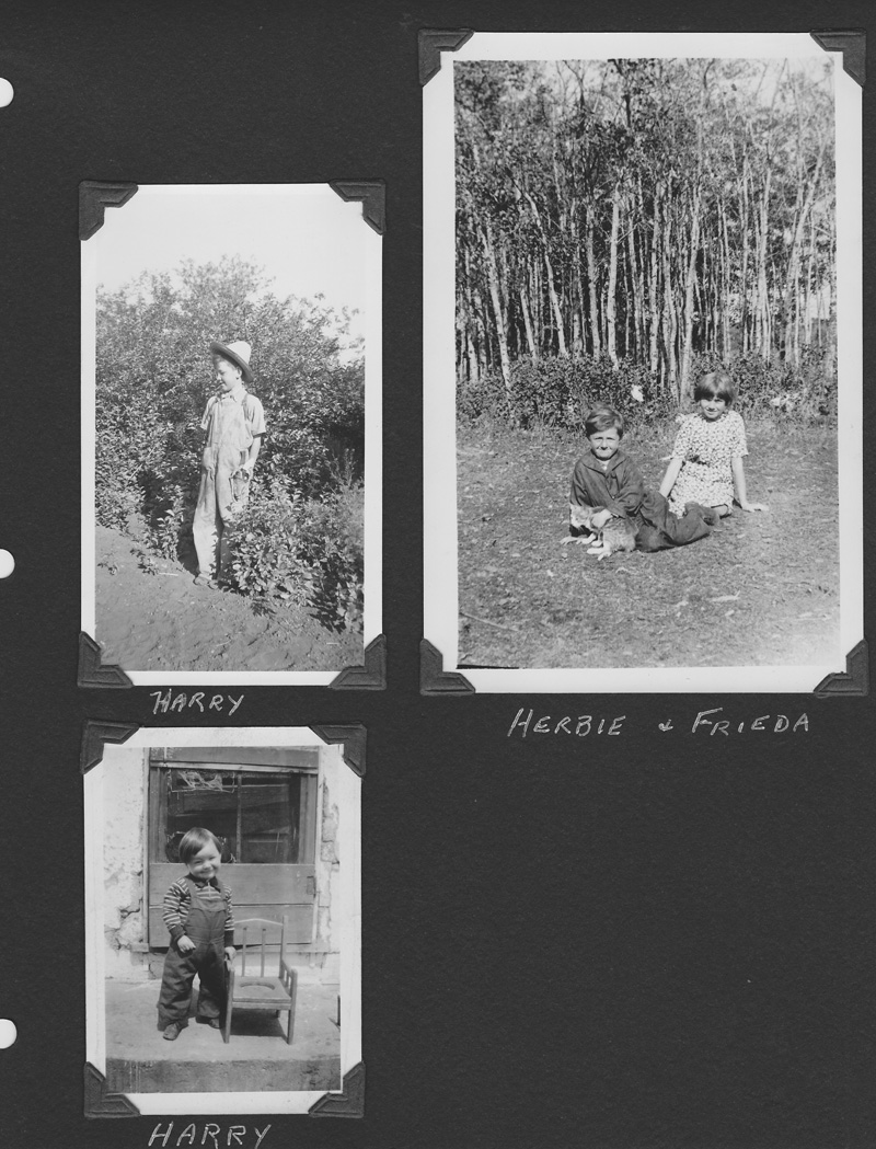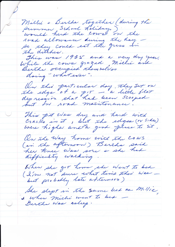 Millie and Bertha together (during the summer school holidays) would herd the cows on the road allowance during the day so they could eat the grass in the ditches. This was 1935 and a very dry year. While the cows grazed, Millie and Bertha occupied themselves doing "whatever". On this particular day, they sat on the edge of a pit - a little flat depression that had been scooped out for road maintenance.