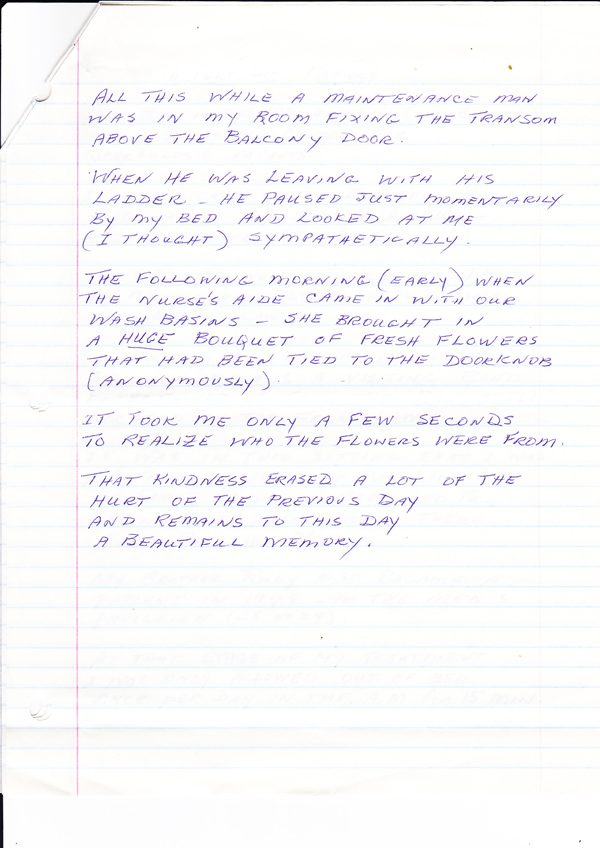 The following morning (early) when the nurse's aide came in with our wash basins, she brought in a huge bouquet of fresh flowers that had been tied to the doorknob (anonymously).