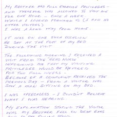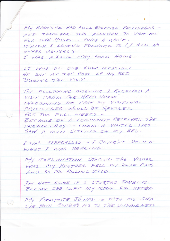 I was speechless - I couldn't believe what I was hearing. My explanation stating the visitor was my brother fell on deaf ears and so the ruling stood. I'm not sure if I started sobbing before she left my room or after. My roommate joined with me and we both sobbed as to the unfairness.