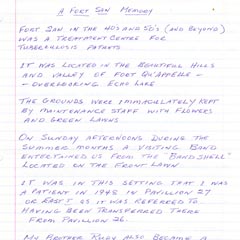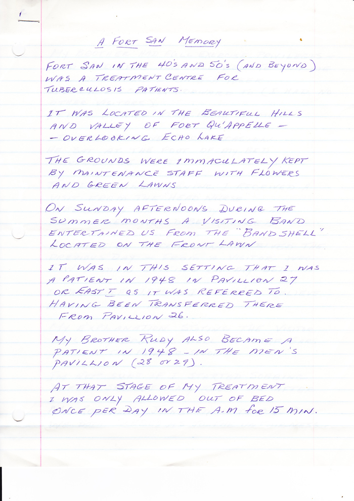 Fort San in the 40s and 50s (and beyond) was a treatment centre for tuberculosis patients. It was located in the beautiful hills and valley of Fort Qu'Appelle - overlooking Echo Lake. The grounds were immaculately kept by maintenance staff with flowers and green lawns. On Sunday afternoons during the summer months a visiting band entertained us from the "Bandshell" located on the front lawn. It was in this setting that I was a patient in 1948 in Pavilion 27 or East I as it was referred to having been transferred there from Pavilion 26.