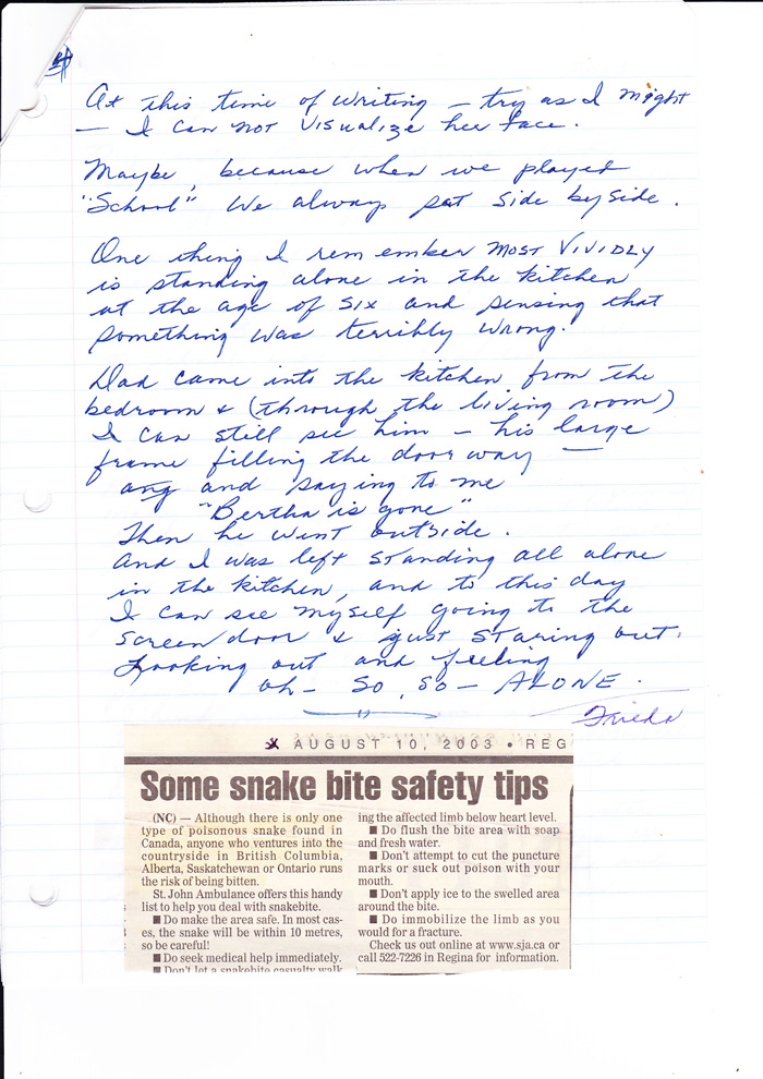 One thing I remember most vividly is standing alone in the kitchen at the age of six and sensing that something was terribly wrong. Dad came into the kitchen from the bedroom and (through the living room). I can still see him - his large frame filling the doorway - and saying to me "Bertha is gone".
