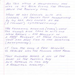 The following morning (early) when the nurse's aide came in with our wash basins, she brought in a huge bouquet of fresh flowers that had been tied to the doorknob (anonymously).